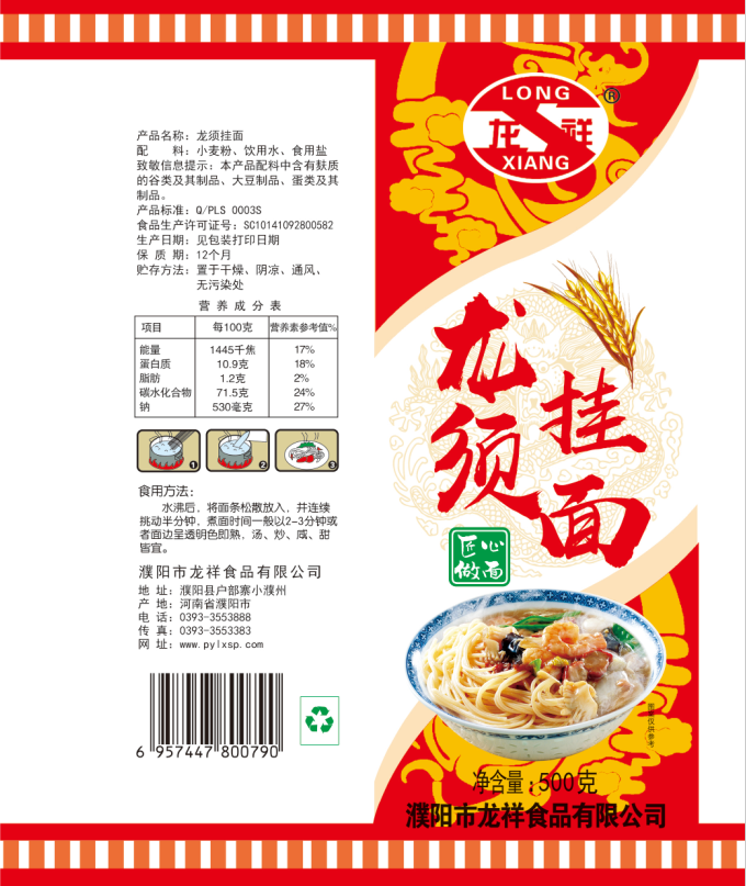 濮陽(yáng)市龍祥食品有限公司位于河南省濮陽(yáng)縣戶部寨鎮(zhèn)小濮州,始建于1994年,前期投資200萬(wàn)元,經(jīng)過(guò)幾年的努力,大力開發(fā)市場(chǎng),由于市場(chǎng)的需求量急劇上升,出現(xiàn)供不應(yīng)求,于2004年擴(kuò)建,建成一座新型的現(xiàn)代化面粉加工企業(yè),并擁有全國(guó)先進(jìn)全自動(dòng)生產(chǎn)設(shè)備一套,產(chǎn)量由以前的100噸/天,提高到現(xiàn)在400噸/天。 2012年再次擴(kuò)大規(guī)模申請(qǐng)為濮陽(yáng)市龍祥食品有限公司,注冊(cè)資金500萬(wàn)元。2012年又投資800萬(wàn)元新建掛面生產(chǎn)線一條,日產(chǎn)掛面50噸。龍祥食品有限公司現(xiàn)有職工120余人,總工程師1人,專業(yè)技術(shù)人員10人,經(jīng)濟(jì)師1人,會(huì)計(jì)師1人,銷售人員2人,優(yōu)秀專業(yè)人員20余人?! ↓埾楣咀詣?chuàng)建以來(lái),社會(huì)效益十分可觀。公司一直以“今天的質(zhì)量,明天的市場(chǎng)”為信念,“一切為了客戶需求,竭誠(chéng)追求完美品質(zhì)”為企業(yè)宗旨,走專業(yè)化經(jīng)營(yíng)和職業(yè)化管理的路子。